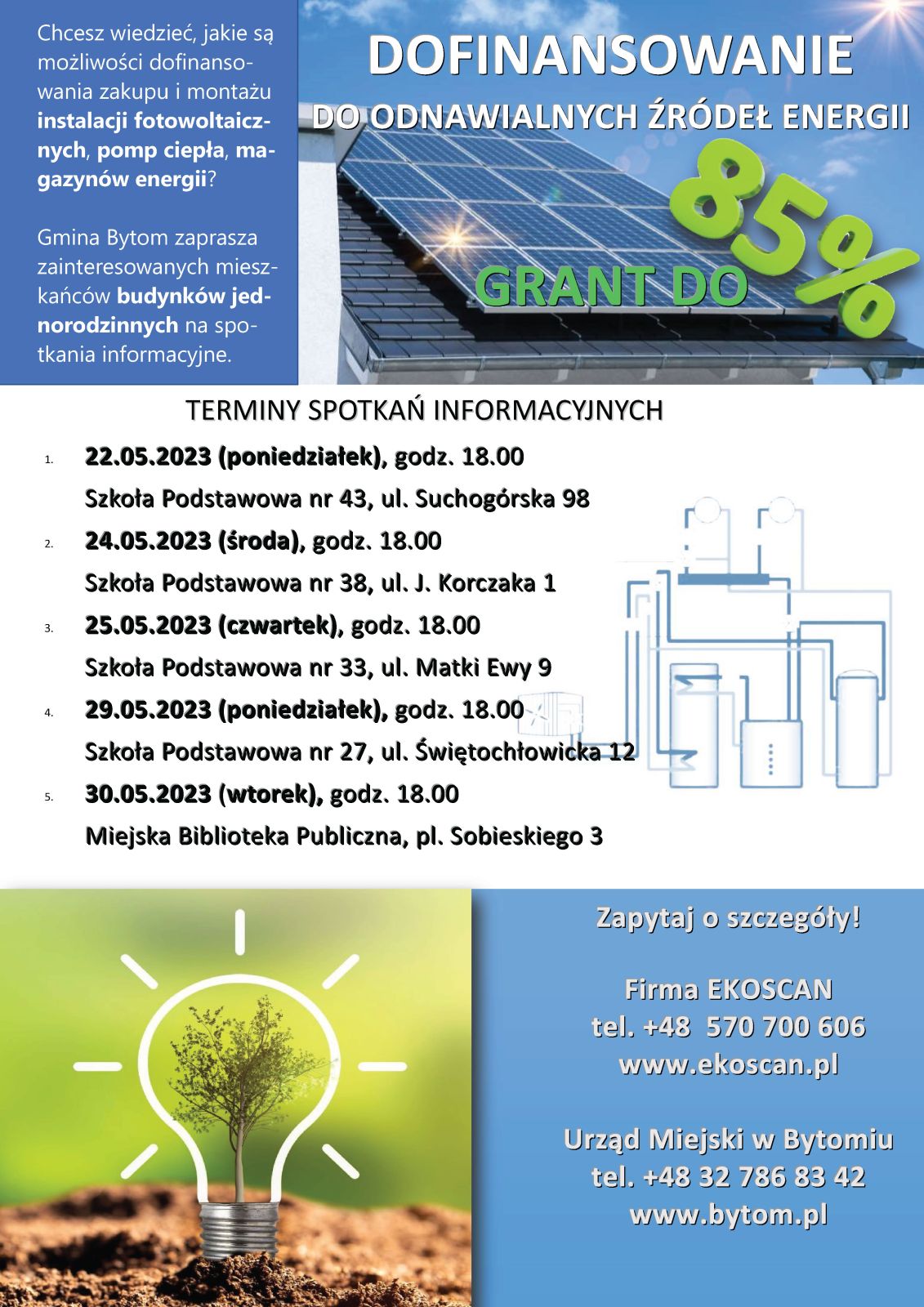Do 85% dofinansowania na instalację fotowoltaiczną, pompy ciepła, magazyny energii elektrycznej i systemy zarządzania energią, czeka na mieszkańców domów jednorodzinnych, którzy skorzystają z projektu „Rozwój energetyki rozproszonej opartej o odnawialne źródła energii na terenie Gminy Bytom. Nabór chętnych ruszy w czerwcu, a już w poniedziałek, 22 maja zaplanowane zostało pierwsze spotkanie informacyjne w Stolarzowicach.